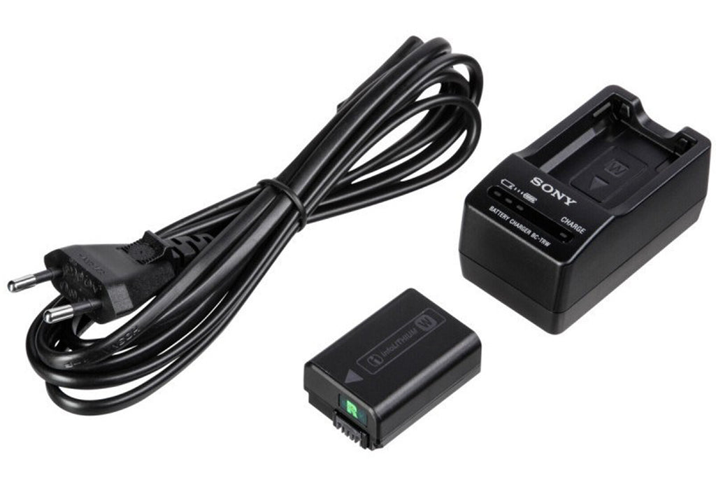Originalt oplader kit til Sony NP-FW50 batterier. Kittet består af en BC-TRW batterioplader, strømkabel og et Sony NP-FW50 batteri.